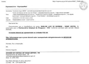 Em 2023, o detento Marlon Luiz de Barros teve a transferência solicitada pelo irmão do coronel Hudson. Um email da Divisão da Central de Vagas informa expressamente que, “atendendo solicitação de Alisson Andrade”, foi autorizada a transferência do preso da Penitenciária de São José dos Pinhas para a Penitenciária Central do Estado.